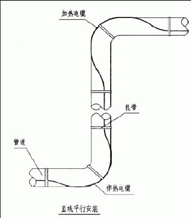 4)直線平行安裝時(shí),伴熱電纜應(yīng)沿彎頭凸面安裝,并在彎頭的兩端及中間作固定 |