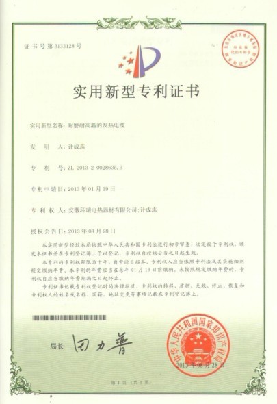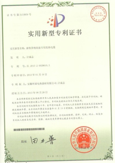 環(huán)瑞自成立研發(fā)小組至科學(xué)技術(shù)中心期間,通過獨立開發(fā),引進(jìn)國外先進(jìn)的生產(chǎn)工藝與技術(shù),與合肥工業(yè)大學(xué)建立長期合作關(guān)系,聘請相關(guān)專業(yè)的技術(shù)專家等模式,投入大量的人力物力。我司以安全,實用性能為目標(biāo),通過改變發(fā)熱電纜結(jié)構(gòu)與原材料,已研發(fā)成功。目前已獲得了關(guān)于畜牧養(yǎng)殖專用的國家專利證書,研發(fā)出耐高溫,耐磨的雙層絕緣的發(fā)熱電纜獲得了2項國家專利證書。包括之間我司獲得的“混凝土養(yǎng)護(hù)發(fā)熱電纜”“天溝融雪專用發(fā)熱電纜”,截止,我司已獲得了5項關(guān)于發(fā)熱電纜的國家專利證書,我司發(fā)熱電纜的生產(chǎn)技術(shù)已達(dá)到國內(nèi)先進(jìn)。共計19項專利。新的專利證書已下達(dá)。