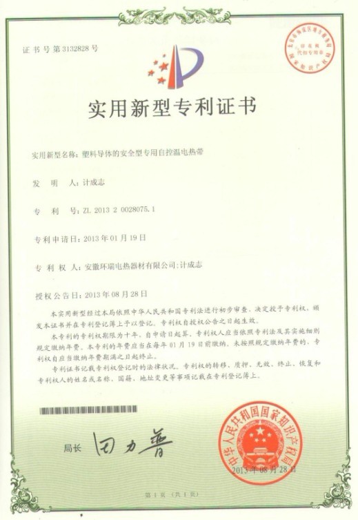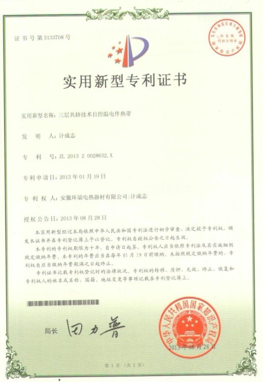 環(huán)瑞自成立研發(fā)小組至科學(xué)技術(shù)中心期間,通過獨立開發(fā),與合肥工業(yè)大學(xué)建立長期合作關(guān)系,聘請相關(guān)專業(yè)的技術(shù)專家等模式,投入大量的人力物力。我司以安全,實用性能為目標(biāo),對電伴熱帶結(jié)構(gòu)、原材料、生產(chǎn)工藝進(jìn)行創(chuàng)新,最新研發(fā)的“三層共擠自控溫電伴熱帶”“ 塑料導(dǎo)體的安全型自控溫電熱帶”獲得了2項國家專利證書。我司已獲得了5項關(guān)于自限溫伴熱帶的國家專利證書,我司伴熱帶的生產(chǎn)技術(shù)已達(dá)到國內(nèi)先進(jìn)。共計19項專利。新的專利證書已下達(dá)。