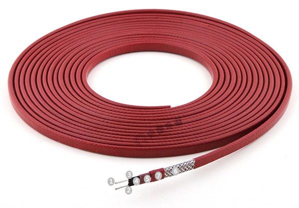 1、銅芯導(dǎo)線 2、低電阻過渡層 3、PTC芯帶  4、改性聚烯烴絕緣層  5、改性聚烯烴絕緣層  6、金屬屏蔽層  7、低煙無鹵外護套(可定制氟塑料護套)